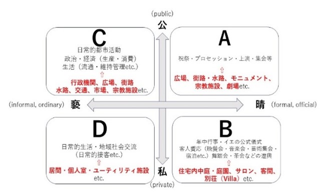 I:歓待インフラの類型化:ハレ(formal/official)とケ(informal/ordinary)、および公(public)と私(private)の概念の二軸から構成される4つの象限で把握(図版参照)