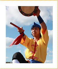 祭り太鼓の創設者で、現在も演出を行う目取真武男さんは、独創的な発想と情熱で多くの若者の心を掴んできた。「5人でもやりたい人がいれば、すぐ支部を作る。その中で、若くてもやる気がある人を支部長にする。皆役割を与えるとやる気になるよ。」目取真さんいわく、結成当時、メンバーは職人や自営業が多く、また中には元暴走族の若者もいた。彼らに祭り太鼓の役職を与え、名刺を持たせたところ、それに見合う働きをしようと頑張るようになったという。