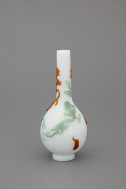 乳白色ガラスを吹き成形し、赤色、アンバー、黄色、緑色の四色の色ガラスを部分的に溶着し、戯れる四匹の雨龍と霊芝雲のモティーフを配している。雨龍は水中に棲むため、しなやかな姿態をもって表わされている。部分的に別のガラスを貼り付ける「熱貼」は、ヨーロッパでは「アップリケ」と呼ばれた。(『ガレも愛した―清朝皇帝のガラス』、サントリー美術館、2018年)