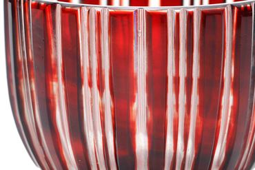 暗紅色の銅赤被せガラスの向付。側面は薩摩縞と呼称される縦縞の切り込みが施されている。側面の紅ガラス表面には、充分な研磨が行われていない型跡が残る。また側面には斜めにマーブル状の縞が認められる。素地ガラスは全体に白い濁りがあり、気泡も若干認められる。底面は十六弁の花弁形である。側面にひび割れがあり、金属片による補修がなされている。虹彩は見込み部分に認められる。(『サントリー美術館所蔵 ガラスの精華』、サントリー美術館、1993年)