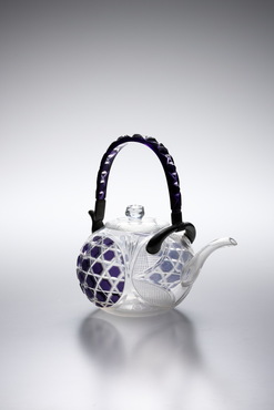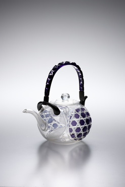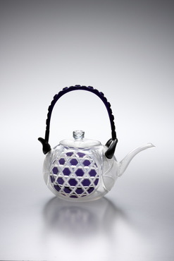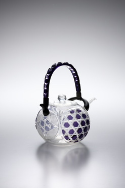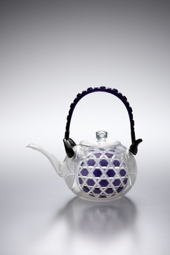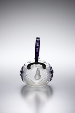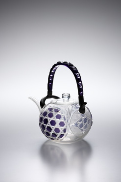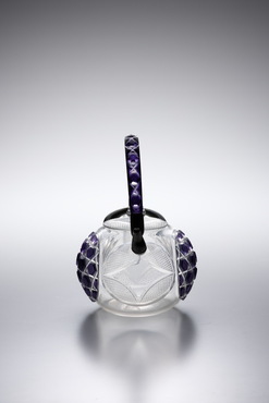 紫色被せガラス部分には、六角格子に魚子文を施し、蓋と胴の無色ガラスには、吉祥文である七宝文が施されている。おそらく、夏に催されたおめでたい宴席に登場したのだろう。紫色ガラスは部分的に融着されたと推測される。淡い紫色がポイントとなり、装飾性溢れる薩摩切子の中でも、清々しい印象を与える一点だ。(『Drinking Glass―酒器のある情景』サントリー美術館、2013年)