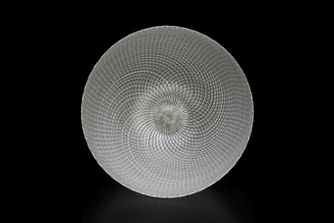 本作品のレース文様は、ヴェトロ・ア・レティチェッロ(vetro a reticello 網目文様)と呼ばれる。右巻き、左巻きに平行するレース文様の素地を一枚ずつ用意し、重ね合わせることで格子文を作る。各々の格子には、ひとつずつ気泡を封入する。レース文様の中でも、最も難しい技術を要する文様だ。まさに超絶技巧の極みと言っていいだろう。シンプルだが細やかなレース文様と気泡が織り成す軽快な仕上がりが、ヴェトロ・ア・レトルティ(vetro a retorti 捻れ文様)とはまた異なる風情を醸し出している。(『あこがれのヴェネチアン・グラス―時を超え、海を越えて』、サントリー美術館、2011年)
