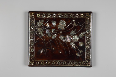 長方形、面取りをした被蓋造の硯箱。総体を黒漆塗として、一部毛彫を施した螺鈿によって文様を表している。蓋表には中央に菊と薄に鈴虫を表し、周囲は四隅に猪目透隅金物形を置きながら、蒔貝(まきがい)と円透文を並べた枠を廻らせる。蓋と身の側面は、各面とも短冊形の切貝を連ねて枠を作ったなかに、西洋的な花クルス文を並べる。身には下水板中央に、七宝によって波兎文をかたどる水滴と、蓮文を浮彫した硯を置く。朝鮮螺鈿風の技法・文様とともに、西洋的な花クルス文を取り入れた異国情緒豊かな作例であるが、全体におおらかで素朴な印象が強い。(『リニューアル・オープン記念展Ⅰ ART in LIFE, LIFE and BEAUTY』、サントリー美術館、2020年)