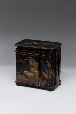 外枠は天板に提手金具をつけ、片側上部の棚に角盆を、下段に四段重を収め、片側には角徳利や引出を備える。総体黒漆地に、外枠天板と角徳利下の引出には水仙の花束を、角徳利には木賊、忍草と蝶、四段重には山水文を金銀蒔絵で表し、外枠の縁には金蒔絵の唐花唐草をあしらう。水仙や木賊・忍草には銀鋲で露を表しており、可憐な華やかさを添えている。(『おもてなしの美 宴のしつらい』サントリー美術館、2010年)