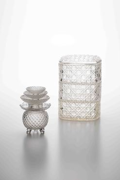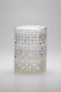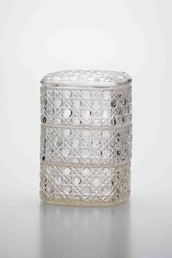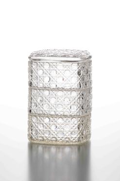 全体を籠目文様が覆おおう三段重。文献によると、江戸のガラス問屋加賀屋の文次郎が、金剛砂を用いてガラスを切る工夫をしたのが、天保5年(1834)のことという。享保年間に洋学が解禁されて研究が進み、厚く良質なガラスが作られて、19世紀前半には切子が可能となったと推測される。こうしたガラス素地や切子を施したガラスは、ポルトガル語でダイヤモンドを意味する「Diamante(ディアマンティ)」から派生し、「ギヤマン」と呼ばれた。(『サントリー美術館プレミアム・セレクション 新たなる美を求めて』サントリー美術館、2018年)