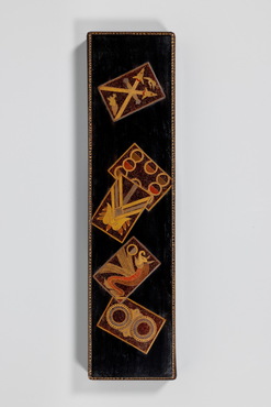 蓋面に五種類のウンスンカルタを配した短冊箱。ウンスンカルタは、ポルトガルからもたらされた「南蛮カルタ」をもとに日本で考案した天正カルタをさらに改良し、元禄年間(1688~1704)頃生み出されたカルタとされる。もともとが舶来品である天正カルタやウンスンカルタは、異国情緒を呼び起こす流行のデザインとして、近世初期の工芸意匠にしばしば用いられた。(『リニューアル・オープン記念展Ⅰ ART in LIFE, LIFE and BEAUTY』、サントリー美術館、2020年)