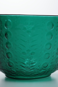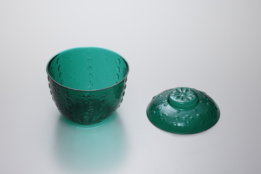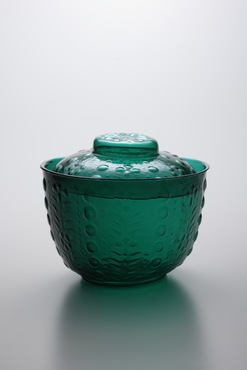 大振りで緑色が鮮明な蓋付鉢。身・蓋ともに水草と泡玉を配している。現代的なデザイン感覚をもうかがわせるこの文様は、当時流行した意匠だったらしく、三段重などにも使われた。蓋のつまみには十弁の菊花文が配される。胴部側面と、高台の底面にみられる型の跡から、割型によって成形されたことが分かる。(『和ガラス 粋なうつわ、遊びのかたち』、サントリー美術館、2010年)