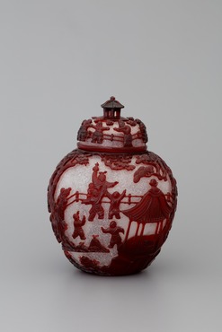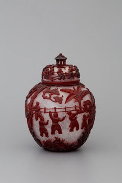 スノーフレーク・グラスに、厚く銅赤ガラスを被せ、大勢の子供たちが遊びに興じる情景を浮彫りにした蓋付壺。靴を蹴り脱いで遊んでいる者、騎馬戦遊びで相手の帽子を取って喜ぶ者、じゃんけんを目前に見合って息を呑んでいる者らが生き生きと表わされる。蓋の上でも、引っ張り相撲のような遊びをしている子供たちが巡る。それぞれの場面に、見守る乳母の愛情深い様子が表わされているのも興味深い。子孫繁栄を願って、たくさんの子供の姿を描く「百子図」の図柄は、およそ唐の時代からあったという伝統的なモティーフ。今にもはしゃぐ声が聞こえてきそうな光景が、見事な彫琢によって連綿と続く。つまみは楼閣形に彫り出されている。(『ガレも愛した―清朝皇帝のガラス』、サントリー美術館、2018年)