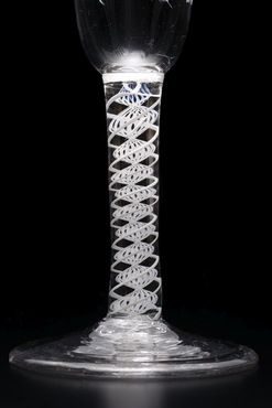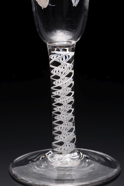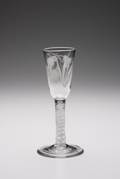 エール用のグラスに、エールの原料となるホップの実がエナメル彩色されている。このエナメル彩色は、18世紀後半、ニューカッスル・オン・タインで活躍し、英国王室御用達でもあったベルビー家(The Beilby Family)の手による。ウィリアム(William, 1740-1819)、メアリー(Mary, 1749-1797)兄妹の施すエナメル彩色は、白を基調とし、上品さが魅力。オペークツイストステムも、均整のとれた二重構造で、小振りながら羨望の的となっただろう。(『Drinking Glass―酒器のある情景』サントリー美術館、2013年)