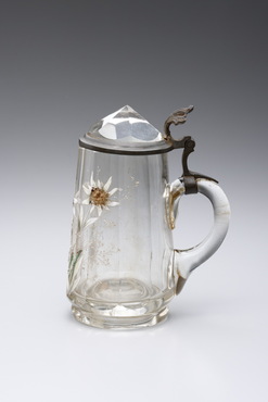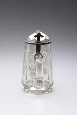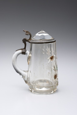 ビアマグは、もともとは炻器(ストーンウェア)や陶器など、不透明な素材で作られたものが主流だった。特にドイツ・ライン河流域で作られた堅く焼き締められた炻器のビアマグは、14-15世紀頃からの伝統を持つ。これに対し、ガラスのビアマグは、ビール文化圏でガラス製作が盛んになり、エナメル彩や彫りの技術が発展した17世紀以降に登場する。ワイン用と同様に、ビールの彩りを愛でることができる。蓋に使われる金属は、ピューター(鉛を主とする合金)製の場合が多く、飲んでいる間に気が抜けてしまわないようにとの配慮から付けられている。場合によっては1リットル以上入るビアマグは、ワイン用に比べ、作りも装飾もおおらかなのが特徴だ。(『ガラスの酒器・ヨーロッパ―ローマン・グラスからアール・デコまで』、サントリー美術館、2003年)