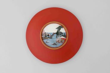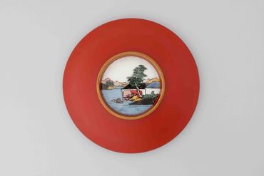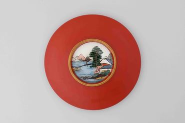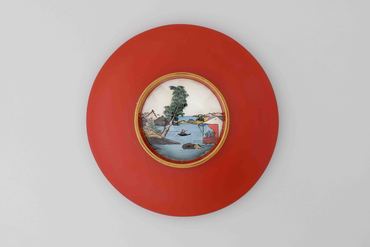 一見、ごくシンプルな朱漆塗の蓋付椀かと思いきや、蓋のつまみの内側の円形部分には、色鮮やかな山水人物図が表わされています。しかもこの山水人物図は、つやつやとした光沢があるうえ、水色・ピンク・白・赤・緑・黄といった斬新な色づかいで平面的に着彩されており、どこかシュールにすら感じられます。 この不思議な山水人物図は「ガラス絵」の手法によるものです。ガラス絵は、板ガラスの裏面に絵を描き、それを表面から見て愉しむ絵画を言います。ガラス特有のつややかな表面の質感や、ガラスに絵具を直接載せることで生まれる瑞々しい発色がその魅力です。 マットな朱漆の質感のなかに、キラリと光る色鮮やかなガラス絵。異なる質感をもつ素材の組み合わせに、この椀を使った人たちもさぞかし驚いたことでしょう。(『サントリー美術館 開館60周年記念展 ざわつく日本美術』、サントリー美術館、2021年)