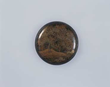 円形、合口造、甲盛を持つ小型の鏡箱。蓋と身の口縁部に、金属製の置口を廻らす。蓋表と側面は黒漆塗に梨子地とし、蓋表に大きく、流水・土坡・竹を金蒔絵、岩・松樹を青味がかった金蒔絵で表す。岩の意匠には、やや盛り上がるような立体感が認められる。底裏面は淡い梨子地とし、松の折枝文を一つ、竹の折枝文を二つ、金蒔絵によって表す。内部は総体黒漆塗とし、文様はない。(『神の宝の玉手箱』サントリー美術館、2017年)