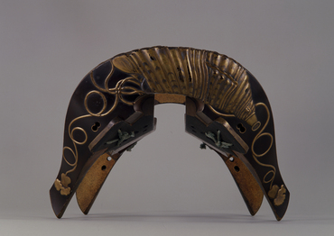前輪と後輪の外側は黒漆地、内側は梨地とし、金銀の高蒔絵で外側から内側に折り返すように大胆に法螺貝を表す。法螺貝には吹口と房付の紐が付く。法螺貝の縞は金と青金、銀の蒔暈しで表わして金の付描で界線を引き、貝の口には銀平蒔絵を、紐は朱漆で盛上げて金蒔絵を施すなど、技巧を尽くしている。居木の上面と両側面は梨地とする。法螺貝は軍陣の合図に用いられ、また仏教ではその大音声が偉大な仏の説法の譬えとされ、諸天の加護を招くとも言われる。居木裏には「寛文十一年/六月日」、「長旨(花押)」の刻銘がある。(『KAZARI 日本美の情熱』サントリー美術館ほか、2008年)