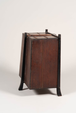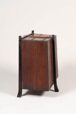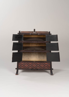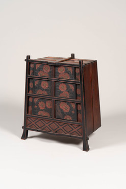 修験者が仏像や経典・仏具、生活用具を納めて背負い、布教や修行の旅に用いた笈。やや裾広がりの箱形で三本の脚が付く。正面上三段に観音扉を備え、そこに椿の木を、その脇に籬に咲く菊を薄肉彫りして色漆で彩色する。椿と菊の花弁は朱漆、葉は緑漆で彩り、花芯と全体に散る露には金箔を押す。下段の菱繋文は黒と朱で彩る。室町時代には内部に納めた仏像や経典を荘厳するため金銅の飾金具を貼る笈が現れるが、本品の加飾も荘厳の一種であろう。しかし力強く伸び多くの花を付ける椿の木は生命力に溢れ、仏教の荘厳の枠を超えている。福島・示現寺の椿文笈(重要文化財)に近似し、同時代・同工房の製作と考えられる。仙台藩伝来という。(『KAZARI 日本美の情熱』、サントリー美術館ほか、2008年)