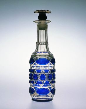 鮮明なコバルト・ブルーの被せガラス酒瓶。側面は、六角籠目に麻の葉小紋と魚子文の組み合わせである。また中央の文様の上下には楕円形の色ガラスに霰文を施した輪結び文様がみられる。素地ガラスには気泡・不純物が散見され、口辺部の仕上げは丸みを帯び、摺り合わせ部分はスリガラス状である。栓の上面は蜘蛛の巣文で、球形部分は藍色ガラスである。さらに栓の側面には鋸歯文がみられ、栓・身ともに、過剰なほどのカットが施されている。薩摩切子酒瓶中の逸品である。(『ガラスをめぐる4つのアプローチ―技法で見つめる西洋と東洋の名品』、サントリー美術館、2001年)
