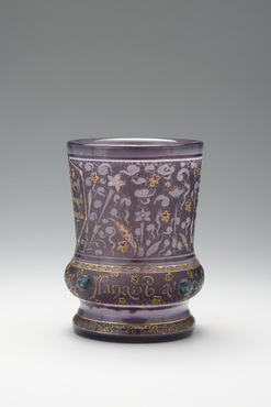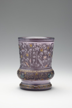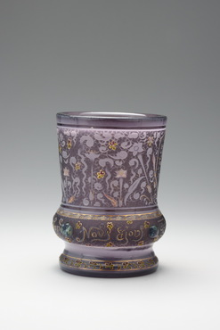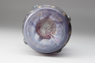 イスラムガラス風に仕上げられた煙草入れ。紫色の透明ガラスに乳白の半透明ガラスを被せ、全体をエッチングで彫った後、エナメル彩と金彩によって装飾性を高めている。書かれた文字や、器全体を文様で埋め尽くす表現方法は、エナメル彩色したイスラムガラスに典型的な手法である。側面に彫り描かれた立ち上る煙の様や色彩は煙草入れにふさわしい。リヨン出身の詩人ジョセフィン・スラリ(Joséphin Soulary, 1815-1891)の詩の一文が彫られ、幻想的な風情を一層高めている。(『オルセー美術館特別協力 生誕170周年 エミール・ガレ』サントリー美術館、2016年)