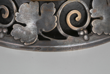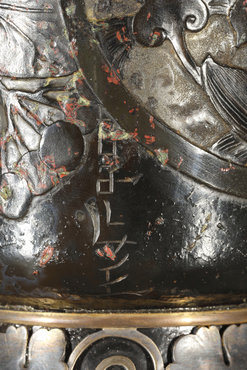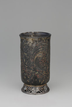 胴部に花、ハナウド、三日月、短冊文様など数々の日本的なモティーフをちりばめながら、赤錆と青錆とで錆びついた東洋風の器を表現している。その形態、大きさから、自らがコレクションする日本の花器の形態を模したのだろう。そして新約聖書から「善意、美、富、貧困、放棄、永遠、日々、慎ましさ、知、正義、敬意」といった単語を引用するとともに、マタイ福音書六章十九節を念頭においた「少しも錆びることのない宝をたくわえなさい。」との銘文が刻まれている。決して錆びることのない精神性を賞賛するとともに、錆びゆくもの、朽ちていくものの無常観に共鳴しながら、その素材感や手触りまでもが情感を込めて表わされた、悲哀に満ちた作品である。(『オルセー美術館特別協力 生誕170周年 エミール・ガレ』サントリー美術館、2016年)