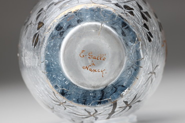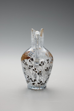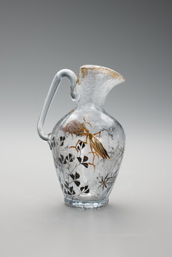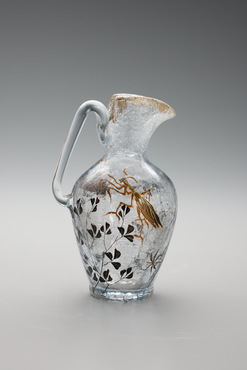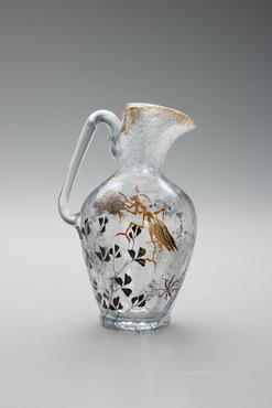 かまきり、蟬、竹、萩といったモティーフばかりでなく、エナメル彩や金彩の使い方にも日本美術の影響を強く感じさせる水差。1889年パリ万博の出品解説書において、ガレは新しいエナメル彩装飾の展開について述べている。その中で「1878年の万博では、日本風の立体的なエナメル彩色を呈示、ガラスに適用した」と語っているが、この水差のかまきりや蟬に見られるエナメル彩の盛り上げ方は、その一例であろう。また、注口周辺に見られる金彩のぼかしも、蒔絵の手法を思わせる。一方、月光色ガラス全体に見られるひび割れ文様は、「アイス・クラック」というヴェネチアン・グラス由来の手法で施されている。(『オルセー美術館特別協力 生誕170周年 エミール・ガレ』サントリー美術館、2016年)
