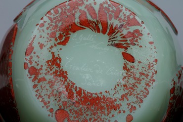 翡翠を模したガラスに褐色のガラスを被せ、大胆な植物文様に彫り出した壺。1889年のパリ万博の出品解説書の中で、ガレは中国の翡翠の模倣についても触れている。一方マーブル状の褐色のガラスについては、彼が同解説書で「灼熱の種まき」と呼んだ手法で発色させたものと考えられる。底面のサインから、ガレがたびたび作品を卸していたパリの高級宝飾店エスカリエ・ド・クリスタル社によって販売されたことがわかっている。(『ガレも愛した―清朝皇帝のガラス』、サントリー美術館、2018年)