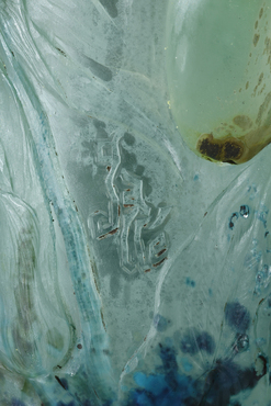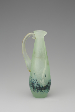 色彩を抑えたデザインながら、高い彫りの技術力と、柔らかな風情を感じさせる。部分的に褐色、青緑色に発色させた淡青緑色の素地に、水辺の植物こうほねを浮彫にした水差。(『オルセー美術館特別協力 生誕170周年 エミール・ガレ』サントリー美術館、2016年)