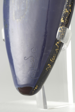 アカンサスは、地中海沿岸地方に分布する植物で、ギリシャの国花にもなっている。この瓶の栓はアカンサスの葉の形を成しており、古代ギリシャ・ローマ建築の柱頭によく見られる意匠としても知られている。底が尖った独特な形態は、紀元前15世紀頃から中東に現われ、その後古代ギリシャ・ローマで、ワイン入れやオリーブオイルいれなどに使われた器「アンフォラ」からヒントを得ている。柔らかい地中に挿して使われたため、こうした形となった。オルセー美術館蔵のデッサンから、専用の脚も並行して考案されていたことがうかがわれる。双方で把手の形が異なり、本作では穴が開けられているため、鎖などを通して使われた可能性も考えられる。(『オルセー美術館特別協力 生誕170周年 エミール・ガレ』サントリー美術館、2016年)