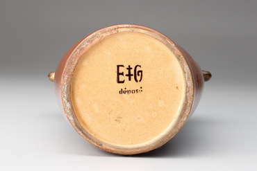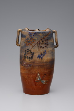 胴部が前後から押しつぶされたように、内側に凹んだ形の花器。まるで布を象ったような口は、菱形に歪む。正面には南天の上空に銀色の三日月が浮かび、背面には南天を思わせる枝の下を一匹の蜉蝣が舞う。背景の朱色から紺色に変化する色調は、夕方から夜へと刻々と移り変わる時の経過を思わせて美しい。モティーフのみならず、盛り上げられた絵付、地に施された金彩の様子は、日本美術からの影響を感じさせる。(『オルセー美術館特別協力 生誕170周年 エミール・ガレ』サントリー美術館、2016年)