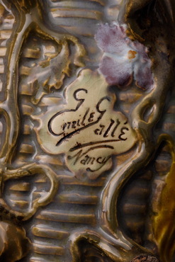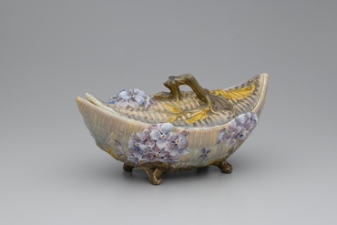 籠に紫色の紫陽花の枝が添えられた形を象ったスープ入れ。パステル風の色調が愛らしい。紫陽花をモチーフとした鉢が松江北堀美術館に所蔵されているが、それは1891年にロベール・ド・モンテスキューが着想し、ガレが制作した家具「紫陽花の整理箪笥」からヒントを得て作られたという。このスープ入れも同時期に考案された可能性があろう。蓋の摘み、容器についた四つの脚は紫陽花の枝がモチーフとなっており、ガラスと同様に、装飾と形態の一体化が見られる。(『没後100年記念「エミール・ガレ」展』、サントリー美術館、2004年)