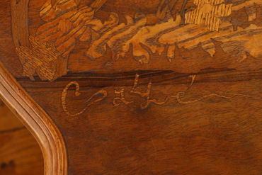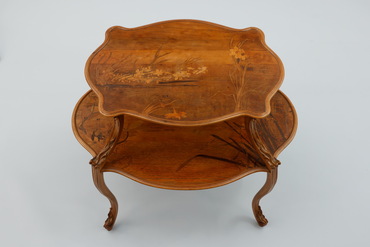 テーブル全体が、滑らかな曲線で構成されたティー・テーブル。上下段とも寄木細工で水仙が象嵌されているが、東洋的な余白の利いた配置となっている。脚も優雅に繊細に曲線を描き、まるで水仙の葉のような風情を感じさせる。緩やかなラインを表わした草案が残されている。(『オルセー美術館特別協力 生誕170周年 エミール・ガレ』サントリー美術館、2016年)