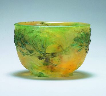 代々職人芸術家の家系に生まれたデコルシュモンは、父が彫刻の教師を務めるパリ装飾芸術学校で主に風景画を学んだが、パリの両親の家に小さな陶窯を作り、陶器制作の研究を重ねた。特に炻器において釉薬と炎によるぼかしを探究した彼は、花や葉をモチーフとした器を作るなどしていた。その後1902年頃から次第にパート・ド・ヴェールによる作品に取り組むようになり、1905年までに、彼の制作は完全にガラス素材に移行されている。当初の作品は光を取り込み、色彩豊かで薄手の半透明な器だった。花や昆虫といった自然をモチーフとした繊細な造形は継続したが、1912年頃より厚手で彫刻的な装飾を伴う作風へと展開する。このシダ文鉢は、おそらくこの展開後の作品で、小品ながら調和の取れた色使いが特徴的である。(『没後100年記念「エミール・ガレ」展』、サントリー美術館、2004年)