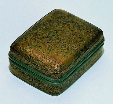 長方形、合口造(あいくちづくり)、甲盛(こうもり)を持つ小箱で、長方形の形状からもとは手箱の内容品の「歯黒箱」であったと考えられる。蓋は塵居(ちりい)を廻らせ、蓋と身の口縁に置口(おきぐち)をつける。総体を黒漆塗とし、地蒔きをほどこした上に蒔絵を主体として文様を表す。《松鶴万歳蒔絵香合》は梨子地として土坡に松と、数羽の鶴を表すなかに、図様に紛らわせる葦手絵(あしでえ)の技法により「万歳」の文字を描く。このように見ると、香合の意匠には吉祥文様が多く、付属する手箱とともにハレの調度としての性格が示される。(『リニューアル・オープン記念展Ⅰ ART in LIFE, LIFE and BEAUTY』、サントリー美術館、2020年)