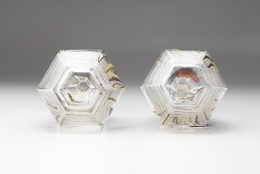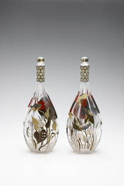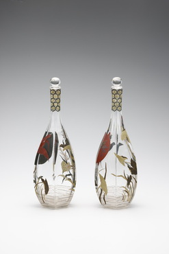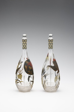 水辺の草花の上を鳥が舞う。口周辺を飾る文様は日本でもおなじみの、花菱亀甲繋文である。花菖蒲やオモダカのモティーフは、葛飾為斎(1821-1880[文政4-明治13]年)の『花鳥山水図式』(全5編、1847-1865[弘化4-慶応1]年)の各所からの転用である。為斎は北斎晩年の門人だが、決して創作点数の多い画家ではない。ここにジャポニスム熱の高さを窺い知ることができよう。基底部には金彩で、ガレも作品を卸していたパリの高級宝飾店「エスカリエ・ド・クリスタル社 パリ」の署名がある。(『ガレとジャポニスム』、サントリー美術館、2008年)