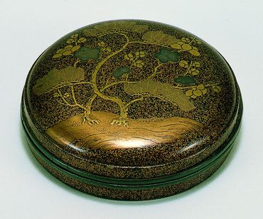円形、合口造、甲盛を持つ小型の鏡箱。同じ意匠を持つ《松梅蒔絵香合》(漆工151-8)と、元は手箱の内容品として一具をなした可能性がある。蓋と身の口縁部に、金属製の置口を廻らす。蓋表を梨子地とし、土坡に互いに寄り添うように立つ松と梅を表す。松、梅の幹や枝は薄く盛り上げ、随所に切金を置く。ふっくらとした梅花が愛らしく、梅花の一部には金貝も用いている。蓋裏は梨子地、蓋裏は淡梨子地とし、その各々に松と梅の折枝文様を交差するように金蒔絵で描く。見込は黒漆塗、無文である。(『神の宝の玉手箱』サントリー美術館、2017年)