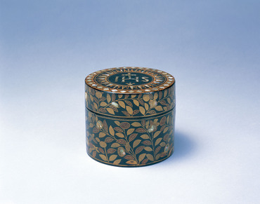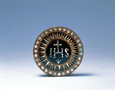 キリストの肉体としてのパンを入れる聖餅箱の遺品は、世界中でもそう多くなく、貴重なものである。本作は、印籠蓋造で上げ底とし、他作例から本来は懸子がついていたことが考えられるが、現在は残っていない。蓋表にイエズス会の紋章を、その周囲に幾何学的な鋸歯文を、金の平蒔絵と螺鈿によってあらわす。蓋鬘から身にかけて、絵梨地もまじえながら草花を描き、所々には蝶が舞う。このように草花の文様を側面に描きこむ文様構成は、聖餅箱の遺例中最も多い。螺鈿は不整形で、上から蒔絵によって細部が描き加えられ整えられるのは、簡便な技法を特徴とする南蛮漆器に多く見られるものである。(『南蛮美術の光と影 泰西王侯騎馬図屛風の謎』、サントリー美術館ほか、2011年)