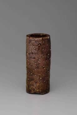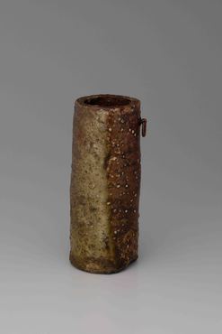 15世紀後半に侘び茶が発展してくると、信楽や備前では本格的に茶陶の生産を始める。本作は中国の青磁筒花生を原型とし、旅寝に用いる枕を連想させるため「旅枕」と称されるが、この種の初期のものとして貴重である。単純な筒型の器体は厚手で固く焼き締まり、片側には自然釉が厚く掛かって暗緑色のビードロ状を呈し、反対側は赤褐色に焼けて白い長石粒が噴き出し、片身替の景色となる。澄み渡る青磁を荒い自然釉に置き換えてしまった日本独特の美意識が垣間見られる。(『サントリー美術館プレミアム・セレクション 新たなる美を求めて』サントリー美術館、2018年)