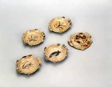 魚の河豚を模したと思われる変形皿で志野焼では珍しい。胴部は轆轤で円形の皿形に成形して底裏に大き目の高台を削り出し、頭や鰭を付け足している。見込の草文は、あまり統一感がなく、頭の斑文なども色々であるが、その自由闊達さが清々しい。表面に重ね焼きの跡がなく、他製品の重ね焼きの最上部で焼かれたか、或は一個焼きで焼かれたと見られる。(『おもてなしの美 宴のしつらい』サントリー美術館、2010年)