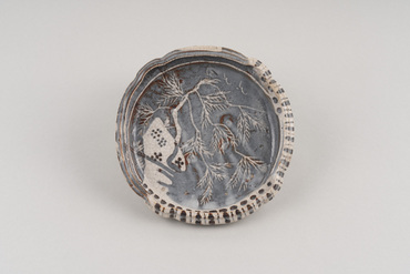 中世瀬戸窯の流れをくむ美濃では16世紀末から17世紀にかけて、力強い形姿と文様を持つ魅力的な茶陶が焼かれた。本作は厚手の平鉢で、鼠志野の技法が存分に生かされている。捻り返した口縁は四方が緩やかに摘み出され、底裏の四隅には半環足が付く。見込全体に鬼板を流し掛け、掛け残された余白を山に見立て、山の斜面に立つ樹木と飛ぶ鳥、梅花文を掻き落しでリズミカルに描き加える。口縁には縞文と連珠文を不規則に配する。(『サントリー美術館プレミアム・セレクション 新たなる美を求めて』サントリー美術館、2018年)