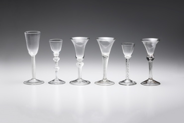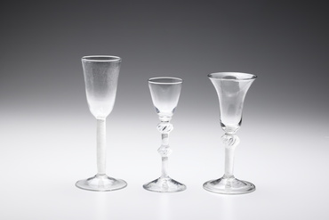 イギリスでは、16世紀半ば頃からムラーノの職人を招き入れ、ヴェネチア様式の器を作る工房が設置された。しかし、1674-76年頃、自国で開発された鉛クリスタルガラスの登場は、イギリスのガラスをヴェネチアン・グラスからの脱却と、よりシンプルで頑丈な独自のスタイルへと導いた。18世紀半ばには、ヴェネチアの技法に基づきながら、ヴァリエーション豊かなステムをもつゴブレットが開発されていく。本作は、ステムに空気によるレース文様を織り込んだ酒器。当時イギリスではガラスの重量によって課税されたため、空気を利用した装飾法が工夫されたのである。エール(ビールに似た酒)やスピリッツ系の酒用とされる。(『あこがれのヴェネチアン・グラス―時を超え、海を越えて』、サントリー美術館、2011年)