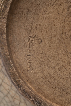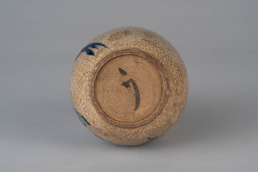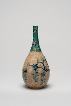 口縁は玉縁状にし、細く伸びる頸はゆったりと卵形の胴に続き、底に低い高台を付ける。頸に下縁を花形にした緑地を施し、上に青い梅花文を散らす。胴には貫入の走る淡黄色の地に青と緑で枝垂桜を描く。本来、暖かい色味の文様を、緑と青の落ち着いた雰囲気に仕上げる。底裏に「御菩薩」の印がある。御菩薩焼は、17世紀中頃、京都市北区上加茂深泥池を発祥とする京焼の窯の一つ。(『おもてなしの美 宴のしつらい』サントリー美術館、2010年)