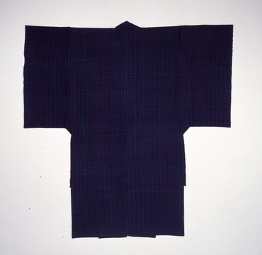 沖縄の織物を語る上で欠かすことが出来ないのが花織、そして絣である。絣は糸を括って防染するなどして、あらかじめ染め分けた絣糸を用いた織物。琉球へ絣の技術が伝播した経緯は、発祥の地とされるインドからインドネシアなど、南方の島伝いの海上ルートを北上したとする説や、中央アジアの陸路を伝わったという説などがあり、琉球の絣織物は日本本土の絣へ大きな影響を与えた。本作は経糸・緯糸の両方に括り糸を使用する経緯絣で、紺地に朱色の格子柄を表している。(『琉球 美の宝庫』サントリー美術館、2018年)