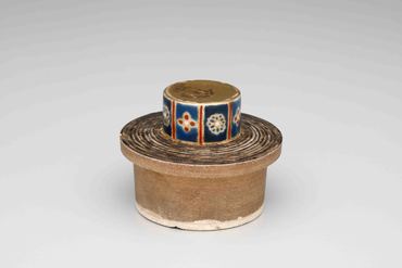 円柱形の胴に、鳥の頭の注ぎ口が付いた水注です。胴部は金と紺を基調に、唐花・七宝・桐・菊花の石畳文で埋め尽くされます。肩下に「源氏巻 全」の題箋、胴部には押え竹と巻緒が象られています。つまりこの水注の胴部は「源氏物語絵巻」を立てた姿で、蓋のつまみは軸端なのです。そうすると注ぎ口は『源氏物語』の「胡蝶」の帖に登場する龍頭鷁首舟(平安時代、貴族が遊宴などに用いた舟)の「鷁」でしょうか。鷁は、中国の想像上の水鳥の名です。 実は本作、中国陶磁にモデルがあるようです。中国・明時代の徳化窯製の白磁水注で、注ぎ口も把手も螭龍を象り、胴には結び紐が設けられています。その結び紐に着目して、日本の絵巻物に置き換え、注ぎ口を螭龍から鷁へとすり替えたのです。過去の名陶の形を踏まえつつも創意の発揮された、おもしろい作品です。(『サントリー美術館 開館60周年記念展 ざわつく日本美術』、サントリー美術館、2021年)