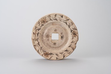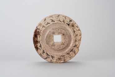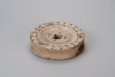 中央に軸を通す正方形の穴を開け、周縁に縄を掛ける溝をつける。両側面に幅広の溝を一周させてその外側に、銹絵で三方に八弁花を置いた唐草を描き、軸穴の四方にも花を描く。胎土は白色で荒い長石を多く含み、全面に透明釉をかけている。(『日本のやきもの千二百年 奈良三彩から伊万里・鍋島・仁清・乾山』サントリー美術館、2001年)
