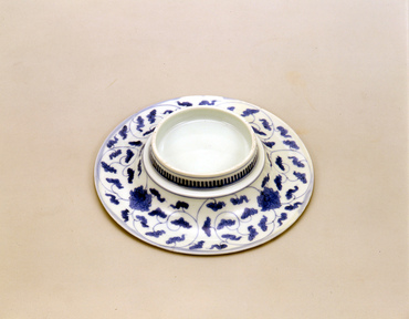 底部を平らに作り縁が腰から反るように広がる器形は、《染付唐花文皿》(陶159)同様珍しい。見込には、菊か雪の結晶か或いは花火か、染付の藍と墨弾きの白で描いた放射状の抽象文様が施され、清新な印象を与える。見込には薄い瑠璃釉と透明釉をかけるが、裏面の口縁部にも薄い瑠璃釉がまだらににじむ。裏文様は三方に牡丹唐草文を置いて全面を埋め、高台には櫛目文を施している。(『日本のやきもの千二百年 奈良三彩から伊万里・鍋島・仁清・乾山』サントリー美術館、2001年)