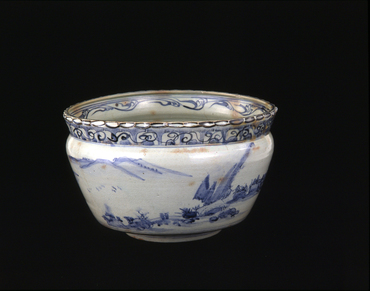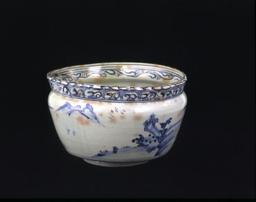 口縁は匙面を連ねて細かな輪花風にし、口縁はやや開いて、楕円形に歪む。口縁下を絞って段をつけ、胴は腰まで緩くすぼませ、腰下は高台に向かって大きくすぼませる。口縁外側に蓮弁文を巡らし重ねて唐草文を描き、口縁内側に雲唐草文を巡らす。胴周りに、やわらかく軽やかな筆致で連続する山水文を描く。やわらかく焼き上がった釉に細かい貫入が入り、内外に御本と呼ぶ淡紅色の斑文が現われる。低い高台の内側は、不整形に露胎となり、指跡が残る。(『日本のやきもの千二百年 奈良三彩から伊万里・鍋島・仁清・乾山』サントリー美術館、2001年)