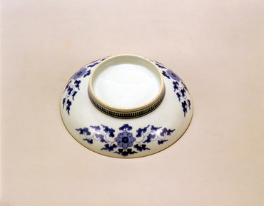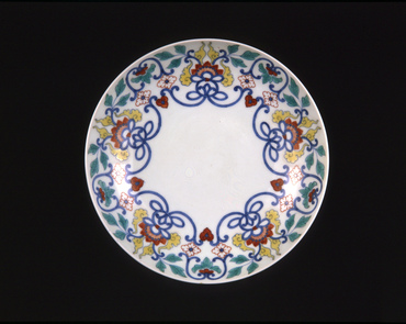 見込周縁には五方に唐花を配して唐草で繋ぎ、中央が星型に抜ける。上絵の赤・黄・緑の花や葉が染付の藍で繋がれ、巧みに構成された文様がバランスの取れた色構成で表現されている。裏文様は三方宝相華唐草、高台に櫛目文を施す。(『日本のやきもの千二百年 奈良三彩から伊万里・鍋島・仁清・乾山』サントリー美術館、2001年)
