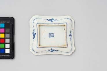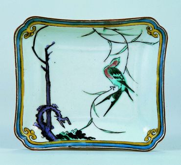 縁を四辺が少し湾曲した入隅の長方形とし、縁は浅く緩く立ち上げ、ややすぼまり気味の方形の高台を付ける。口縁内側を白・青・黄の帯で縁取り、黄の帯は隅で蕨手状に巻く。見込には、柳の古木が画面をはみ出して細枝を垂らし、そこに一羽の燕が留まる様を、黒の線描と赤・緑・紫で描く。口銹を施し、裏面周縁に唐草を、高台脇に二重線を染付で巡らせ、高台中央に染付の角福銘を書く。(『日本のやきもの千二百年 奈良三彩から伊万里・鍋島・仁清・乾山』サントリー美術館、2001年)