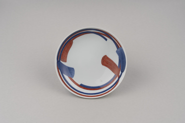 見込の周囲に沿って染付と赤各2本の紐を配して、中央を白抜きとする。紐どうしの重なりには変化をつけて巧妙に単調化を避けている。鍋島でも斬新な構図として名高い作品である。細線を引き連ねた紐の描写や、房の先端の点描は、精緻を極める。裏文様は三方に花唐草文を配し、高台には櫛目文様がめぐらされている。(『日本のやきもの千二百年 奈良三彩から伊万里・鍋島・仁清・乾山』サントリー美術館、2001年)