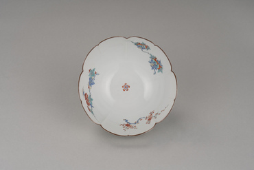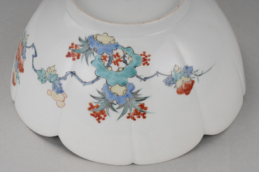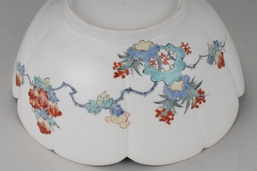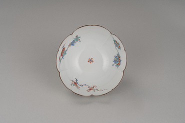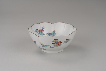 型打ち成形による薄手の半球状の鉢。白色の胎土には薄く透明釉が掛かる。口縁を五弁花形にかたどり、口銹を施し、見込の中心に小さい五弁花を、見込周縁に柘榴・梅・牡丹を、外側面に牡丹と葡萄棚を、黒の輪郭線と赤・黄・緑・青で描く。濁手と呼ばれる白磁素地に明るく澄んだ色を用い、余白の美を生かした典型的な柿右衛門様式の作例である。広島県立美術館に類品(重要文化財)がある。(『サントリー美術館プレミアム・セレクション 新たなる美を求めて』サントリー美術館、2018年)
