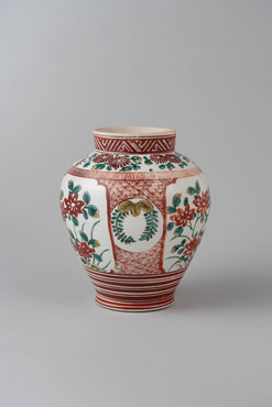 首はわずかに外へ開きつつ立ち上がり、大きく張り出した肩から急激にすぼまり、裾でわずかにくびれた壺。口には一部釉薬がかかっておらず、元は蓋を伴ったのではないかと考えられる。染付を用いず、暗い赤、黄、緑、黒を用いた上絵が施されている。口には、赤で紗綾形文を描き、肩には菊の折枝文様を帯状にぐるりと描く。胴には、花卉を描いた大きな窓絵が三つと、桐、藤、蔦を描き入れた小さな窓絵が三つ、交互に配置される。窓絵の外側は、赤い格子入りの七宝つなぎ文で埋められ、裾にはこまのように太い赤の縞文様がめぐっている。底面には、畳付以外のほぼ全体に釉薬がかかり、砂粒が付着する。海外輸出初期の色絵伊万里の例と考えられる。(『IMARI/伊万里 ヨーロッパの宮殿を飾った日本磁器』サントリー美術館ほか、2014年)