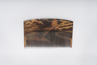 歯を含む櫛の全面に、淀城の天守、淀川沿いの城壁に回る水車を描く。左側の遠景に見えるのは古来の歌枕・男山である。表裏でほとんど同じ図様に見えるが、一面は男山の上に金色の月が昇っているので夜とわかる。一方で、もう片面は赤色の太陽であるため日中であり、男山の麓には鳥居の姿も隠れるように見えている。これは男山の山頂に鎮座する石清水八幡宮の存在を暗示したものでろう。山城国の新旧の名所を取り合わせ、櫛の表裏で自時刻の移ろいを表現した心憎いデザインである。(『歌枕 あなたの知らない心の風景』、サントリー美術館、2022年)