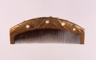波頭をともなう激しい波の表現に千鳥が飛ぶ意匠の櫛。珠のかたちで螺鈿が象嵌されており、金蒔絵のなかでアクセントとなっている。(『水と生きる』サントリー美術館、2007年)